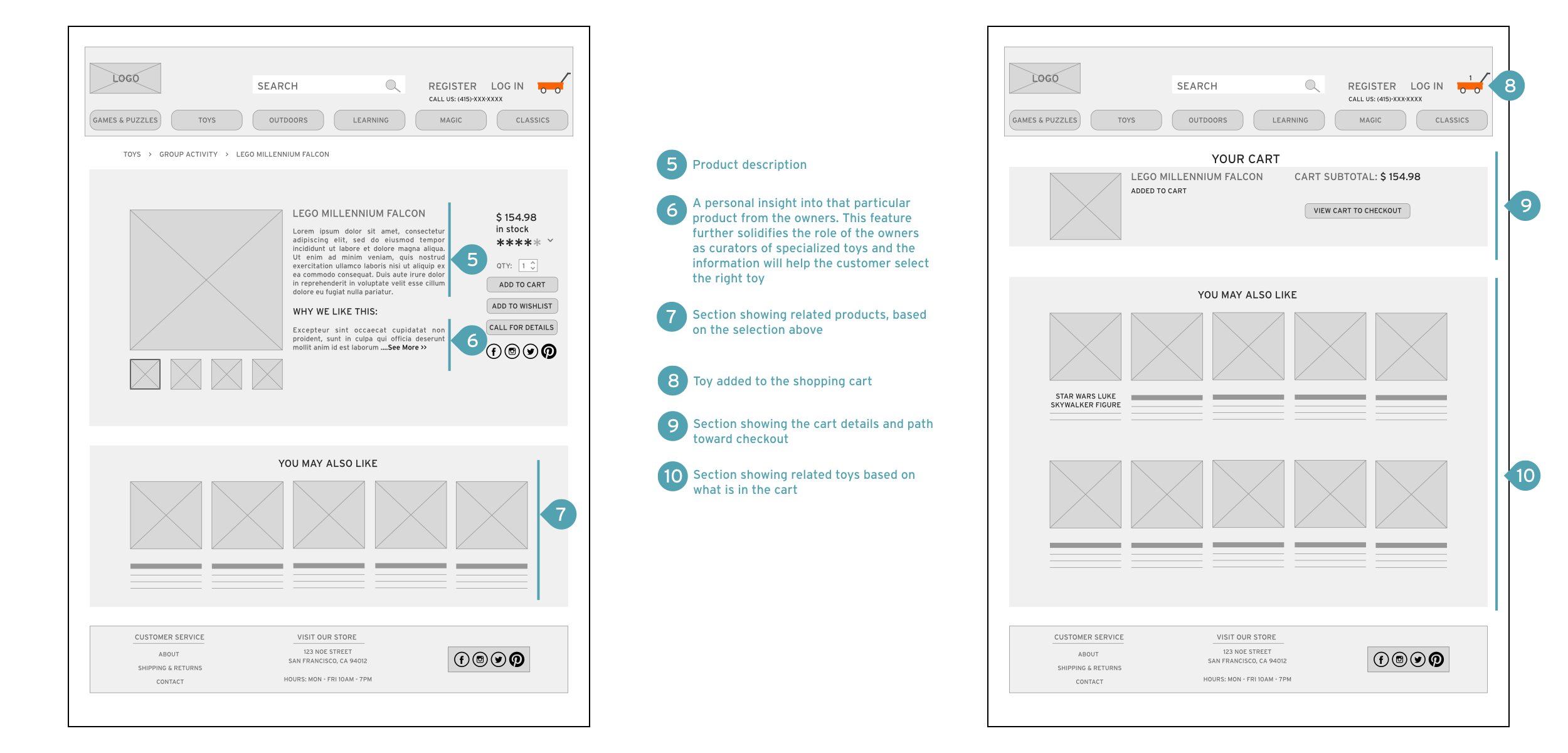 Wireframes were done first with pencil and paper to decide the scheme. After going through a few iterations and understanding the client's needs, I decided to feature a carousel of images displaying the essentials of the store on the home page as the central theme of that page, as opposed to featuring products as the central theme. This was done to portray the uniqueness of the store and its place within the San Francisco toy market. This feature also gave the client an opportunity to tell their story and create a sense of connection with the visitor of the website.